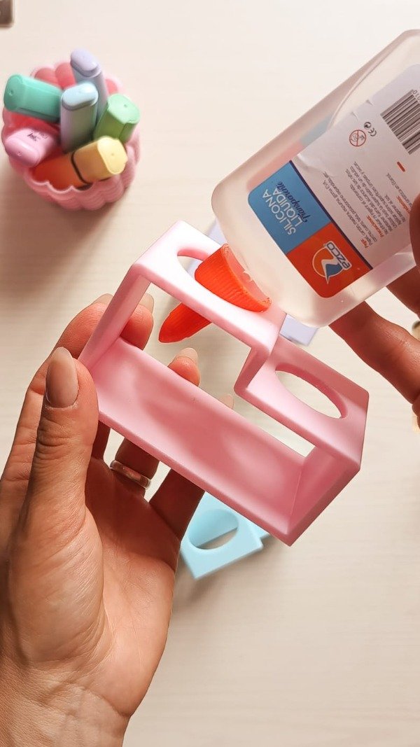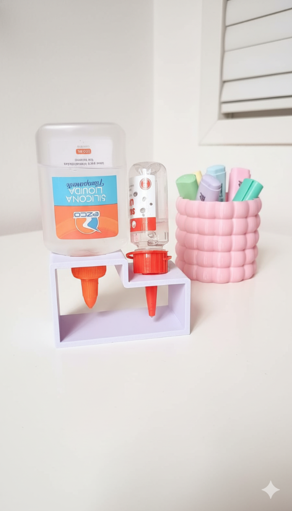Soporte diseñado para mantener los tubos de pegamento boca abajo, evitando así que la boquilla se obstruya o tarde en bajar la cola. Cuenta con 2 orificios uno mas grande que el otro para ambos tipos de envase ya sea grande o pequeño.